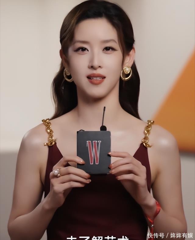 她身穿一袭酒红色长裙,肩膀处是由金色圆环组成的肩带,耳朵上戴着金色拼接珍珠耳环,右手戴有同系列戒指。 脖子上并没有佩戴首饰,露出了光洁修长的脖颈,她的头发别在耳后,额前留些许刘海修饰,妆容精致,大方得体。